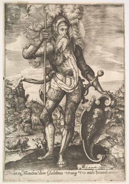 This print, titled "The Blood of the Redeemer", is made by an anonymous artist. The stark contrast between light and shadow immediately draws your eye to the figure of Christ. The artist’s skillful use of line work defines his muscular form and the rough texture of the landscape. A stream of blood flows from Christ’s side into a chalice, visually connecting his sacrifice to the promise of salvation. The composition is structured around the vertical axis of the cross, which divides the earthly realm from the divine. This division prompts us to consider the symbolic meaning of the image. The juxtaposition of the idealized figure of Christ and the everyday scenes suggests a tension between the sacred and the profane. Consider how the anonymous artist has created a powerful statement about faith, sacrifice, and redemption. The artist invites us to contemplate how these themes intersect with our own understandings of meaning and value.