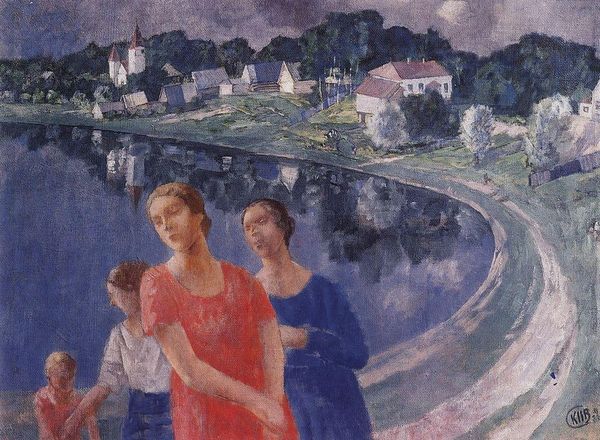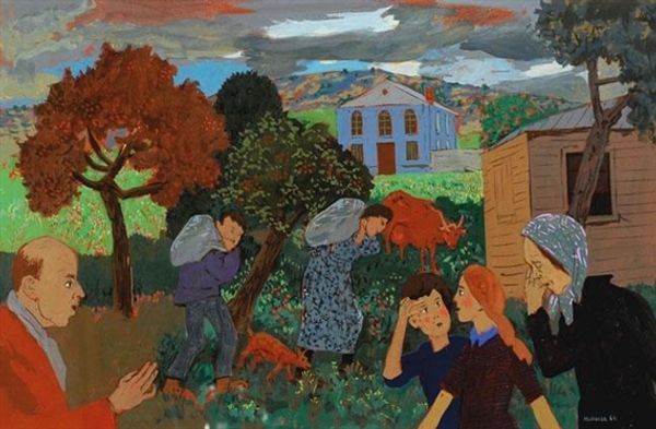 Editor: This is "Figures Talking in a Village," an oil painting by Grégoire Michonze from 1966. The figures seem quite serious. What do you see in this piece, beyond the surface-level genre painting? Curator: It’s a powerful snapshot, isn’t it? Michonze painted this in a time of immense social and political upheaval. I see more than just figures talking; I see a reflection of community, perhaps even resistance, told through the visual language of the everyday. Look at the way the women dominate the composition. What do their expressions convey to you? Editor: Worry, maybe concern, but also strength. There's a directness in their gazes, even the man on the left has an intense expression, like something important is happening. Curator: Exactly. Now, think about the village setting itself. How does the rural environment play into the narrative? Remember, the mid-20th century witnessed rapid urbanization. Editor: So, perhaps Michonze is highlighting the anxieties or tensions between tradition and modernity, played out within the confines of this village? Almost like the village represents a microcosm of society grappling with these larger changes. Curator: Precisely. And who holds the collective wisdom and communal power in such a space? The women. Notice their engagement and active participation in what we can assume is a matter of great importance. This seemingly simple scene carries the weight of broader socio-political commentary, positioning these figures as active participants in a changing world rather than passive observers. It's about the power of connection in a space undergoing transformation. Editor: That gives me a new perspective. I initially saw it as just a scene, but understanding the historical context reveals so much more depth. It highlights voices we might not have otherwise noticed. Curator: Indeed. And hopefully it inspires us to consider art as an archive of social realities and challenges us to listen to those voices.