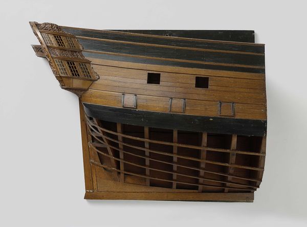 This wooden model by Rijkswerf Vlissingen captures the stern of an 84-gun ship of the line, a vessel embodying power and dominion over the seas. The stern, with its stacked windows, is not just a structure but a symbol. Historically, ships were vital arteries for trade and warfare, their design laden with national pride. The layered construction echoes the ziggurats of ancient Mesopotamia, structures designed to bridge the earthly and divine realms. Just as those ancient forms sought to touch the heavens, the ship, too, reaches—not for the sky, but for distant shores and new horizons. Consider the psychological impact of the sea: it represents both limitless opportunity and terrifying uncertainty. The ship, then, becomes a vessel for our collective anxieties and aspirations, a potent symbol of human endeavor against the backdrop of the unknown. Its image resonates across time, stirring deep-seated emotions tied to exploration, risk, and the yearning for what lies beyond.