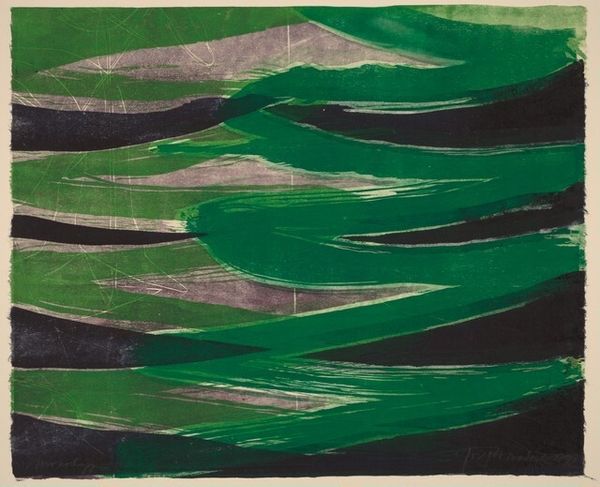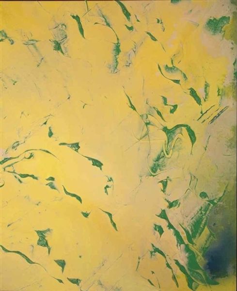 Curator: Well, here we are in front of "Giallo," painted in 1969 by Carla Accardi. At first glance, what strikes you about it? Editor: It's surprisingly…calm. Despite the boldness of those yellow strokes, there's a quiet energy. It almost feels like a field of wheat viewed through a heat shimmer. I can almost hear the cicadas buzzing in the heat. Curator: I love that image. For me, the "giallo" – which means yellow in Italian, of course – hints at something deeper. While it literally is just the yellow, this "giallo" period, it’s like Accardi's exploring that raw, almost aggressive, energy hidden within seeming simplicity. Editor: It’s interesting that you call it aggressive, because I am viewing this through the lens of Arte Povera—which challenged traditional art materials and sought to destabilize dominant power structures. Yellow has a really subversive potential. It embodies both visibility and caution; the warm tones, and even evoke the sun's violence in how it contributes to climate change. Curator: See, that is a fascinating reading of the color itself! What I find interesting is how these translucent yellows hover over the ground, almost like light breaking through. It really opens itself to a lot of possible interpretations. Maybe I read aggression in because I know where the artist would go next in her career! Editor: Can we talk about what's underneath? How does that material ground function within the politics you have presented? To me the grain offers this idea of organic decay happening at the ground of the aesthetic reading of the color, adding an eerie juxtaposition to our initial read of the yellow. Curator: Accardi's interesting use of materiality also adds so much here. She has those raw surfaces coming out of the paintings like rebellious eruptions against tradition and formality. It's that very rawness that amplifies the whole, unsettling tension of it all. You know, it makes one think a little deeper. Editor: Exactly. It forces you to engage with not just the image but with its sociopolitical undertones, making art that not only speaks to but also questions the world around us. Thanks for speaking to it. Curator: Absolutely. Thanks for pushing my thinking in this direction too.