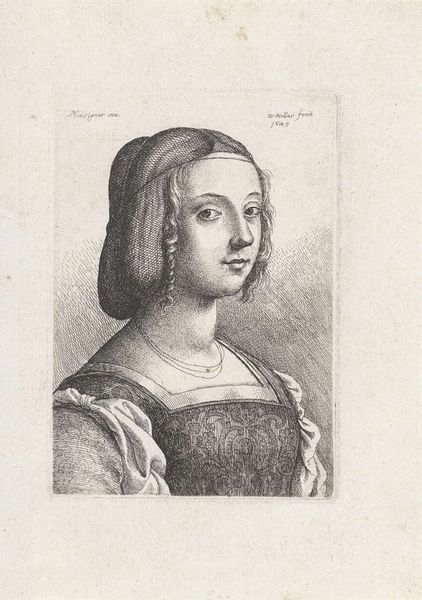 Wenceslaus Hollar created this print of Margaret Griggs in 1648, using the technique of etching. This intaglio process involves coating a metal plate with wax, then drawing an image into the wax with a sharp needle. The plate is then submerged in acid, which bites into the exposed metal, creating an image that can be inked and printed. Looking closely, you can see the fine, precise lines that Hollar used to render the textures of Margaret's fur bonnet and the delicate contours of her face. The etching process allows for a high level of detail, and Hollar was a master of the technique. Consider, too, the labor involved. Each line represents a deliberate act, a physical engagement with the material. Hollar’s skill transforms base metals into enduring images. This print invites us to appreciate the artistry inherent in the making process. It challenges us to look beyond the image itself and consider the skilled hand that brought it into being.