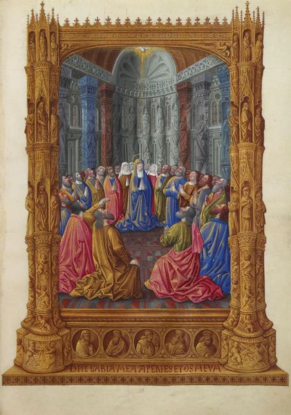 Editor: Ambrogio Bergognone's, *Presentazione di Gesù al Tempio* – or Presentation of Jesus at the Temple, is such an interesting painting done in tempera! I am curious as to how the act of presentation itself contributes to its cultural meaning. What's your interpretation? Curator: Well, this piece presents an idealized vision of religious devotion in Renaissance Italy. Consider the carefully constructed architectural space – it's not merely a backdrop but a symbolic assertion of institutional power. Who do you think this piece might be intended to impress? Editor: Perhaps wealthy church patrons? Or maybe it was meant to remind everyday people of the church's authority? Curator: Precisely! Bergognone strategically employs Renaissance artistic conventions to reinforce religious doctrines and solidify the Church's influence within society. Notice the balanced composition, the serene expressions, and the luxurious fabrics - all meant to evoke reverence and awe. These aren't just aesthetic choices; they're carefully crafted visual arguments. Does the scale or prominence suggest anything about the intended audience or the importance of the piece? Editor: Given the detailed, expensive medium, it's pretty obvious it wasn't a small work. Scale likely allowed for larger audiences to see the details but also conveyed status, not unlike religious structures that dominate skylines. The traditional architecture feels idealized and meant to portray both stability, authority, and grandeur. Curator: Exactly. By understanding the cultural and institutional forces at play, we can begin to unpack how artworks like this contributed to shaping and reinforcing dominant social norms and power structures in their time. The arts served a public and often very political purpose. Editor: It's amazing to think that something so beautiful could also be so purposeful in shaping societal views! Curator: Absolutely! Every detail – from the figures' placement to the architectural setting – speaks volumes about the intricate relationship between art, religion, and society during the Italian Renaissance.