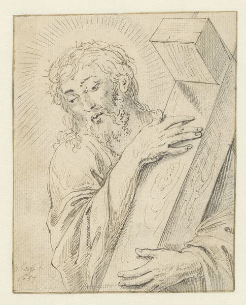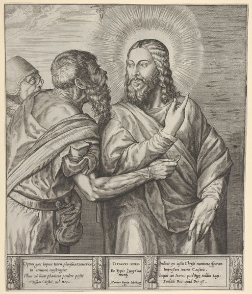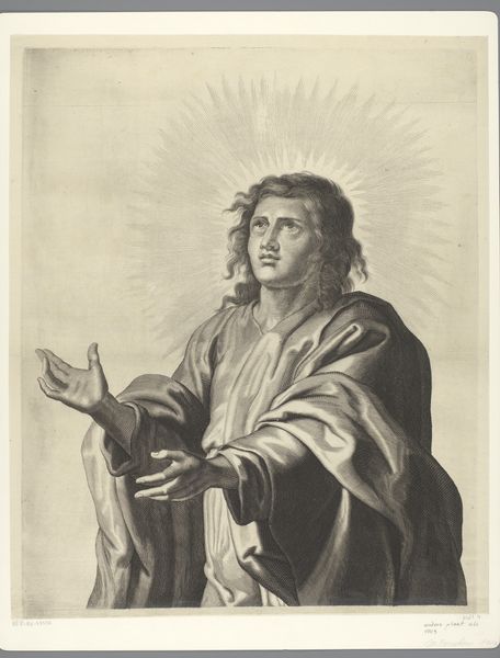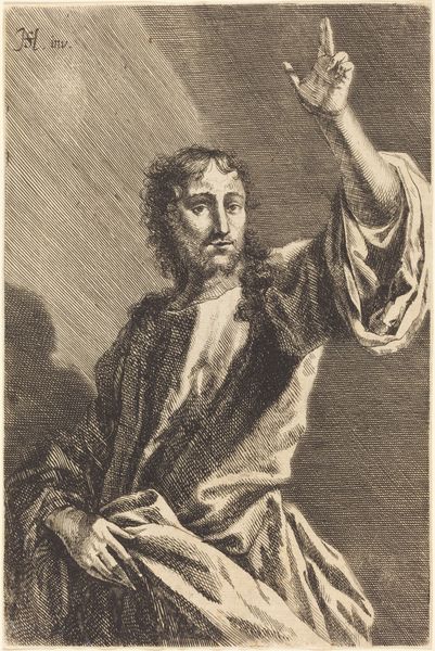 Editor: So, this intaglio print from the 17th century, titled "Christ holding a globe, looking to the left…", is quite striking. The figure of Christ is front and center, bestowing a blessing. I find his gaze quite intense. What stands out to you when you look at this work? Curator: This print resonates with the political and social turbulence of the 17th century. The globe, in Christ's hand, symbolizes not just divine dominion, but perhaps a pointed assertion of power amid widespread social upheaval. How does depicting Christ with typically European features, holding power, influence contemporary interpretations, do you think? Editor: It makes me think about colonialism and how religion was often used to justify it. It almost feels like it could be reinforcing a Eurocentric view of faith. Curator: Precisely. The act of blessing becomes complicated, doesn't it? Think about the indigenous populations who were converted, often forcibly, and how images like this played a role in that power dynamic. The seemingly benign gesture of blessing could be viewed as an act of symbolic dominance. Who does this image serve? What does it leave out? Editor: I never thought of it that way. It really highlights the problematic use of religious imagery. I initially just saw a typical religious scene, but now I'm questioning everything about it. Curator: That discomfort is important. It shows how art can reflect, but also reinforce, systemic inequalities. Examining those layers critically is crucial. Editor: I’ll definitely look at Baroque art differently from now on, considering the historical implications. Curator: And hopefully, we can all move forward a little wiser for it.