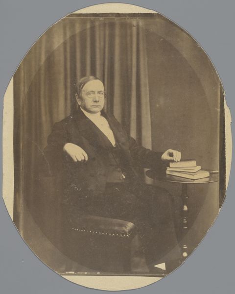 Editor: This gelatin-silver print, "Portret van een zittende man," made sometime between 1880 and 1920, strikes me as incredibly formal. The sitter appears staged, even stoic. What can you tell me about its context? Curator: This portrait really speaks to the burgeoning middle class and the rise of photography as a means of social mobility and representation. What do you notice about his pose, his attire, the props surrounding him? Editor: He seems consciously composed. The suit, the book, even the plant on the table suggest wealth and perhaps intellectual pursuits. Curator: Exactly. These elements were carefully chosen to convey a certain image, signaling status in a rapidly changing society. Think about who had access to photography at the time, and what messages they wanted to project. What’s absent is almost as important as what is present. Editor: So, it’s less about a genuine reflection and more about constructing a desired public persona? It feels like he is crafting an ideal for himself. Curator: Precisely. The photographer and sitter collaborate to produce this representation, reflecting societal aspirations. Editor: I hadn’t considered the performative aspect of early portrait photography so explicitly. Curator: These images were critical in negotiating social identity during a transformative era. Studying them opens a window onto the power dynamics of visual representation and public image-making in modern society. Editor: That is so thought provoking! I'll never see old photographs the same way again.