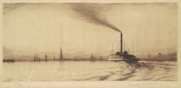 Rominer Lovewell’s “Untitled (Steamship In Boston Harbor)” is an etching that captures a serene yet industrious waterscape. Rendered in sepia tones, the artwork’s composition is dominated by the imposing form of a steamship, its vertical masts and smokestack creating a striking contrast against the horizontal expanse of the harbor. The artist meticulously details the textures of the water and the ship, using line work to define form and capture subtle nuances of light. The reflections on the water’s surface create a semiotic doubling effect, blurring the line between the real and the reflected. These elements evoke a mood of both activity and tranquility, a liminal space where the energy of commerce meets the stillness of nature. Lovewell's ability to merge structural clarity with atmospheric depth transforms the steamship, typically a symbol of modernity and progress, into a subject of quiet contemplation, inviting us to reflect on the interplay between technology and the natural world. The artwork invites endless re-interpretations, influenced by personal experiences and evolving cultural viewpoints.