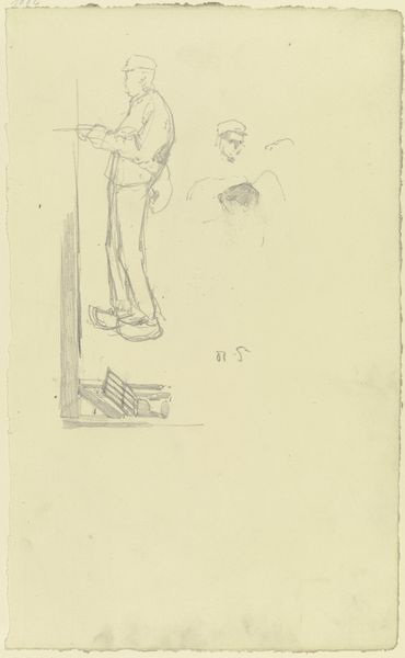 Editor: We're looking at "Egeus, der über die Hochzeit Hermias spricht, mit Stock, Hut und Schwert," a drawing by Paul Konewka from around 1867 or 1868. The medium is very simple - just a pencil drawing. I’m struck by the sparseness of the lines and how much is suggested rather than explicitly drawn. What catches your eye in terms of its formal qualities? Curator: Note how the artist deploys line as a semiotic device to communicate narrative rather than mimetic accuracy. The subject's costume and pose convey specific historical and social meanings that inform the viewer’s interpretation. Do you observe any instances where the line quality influences your interpretation of character or mood? Editor: I do! The wavering lines defining the older figure compared to the steadier, straighter lines for the younger character creates a sense of frailty against strength. It is a stark contrast. Can that intentional contrast tell us anything more about the meaning behind this? Curator: Consider the line not merely as representation, but as structure. The dynamism arises from the vectors created by the walking sticks in opposition with the bodies, this generates tension within the otherwise simplistic figuration. Further exploration is invited, for example what if there are more people that are part of a larger series of works? That would expand upon the individual character of this single composition, would it not? Editor: Definitely! Putting it into a potential series makes it less of an independent observation and perhaps a part of a bigger commentary. It shows how understanding the line contributes significantly to interpreting Konewka's artistic purpose. I appreciate how we’ve moved beyond just describing what we see, but seeing HOW the elements create impact. Curator: Exactly. A valuable engagement with the inherent components of the image allows us access to the broader understanding of how artwork creates an impression.