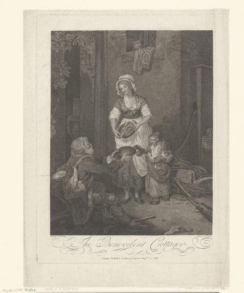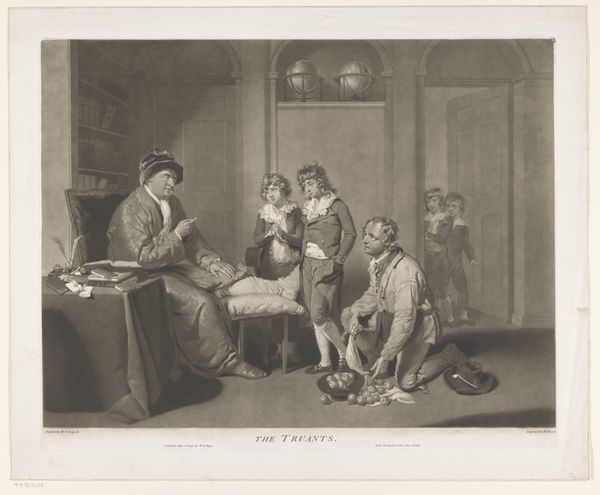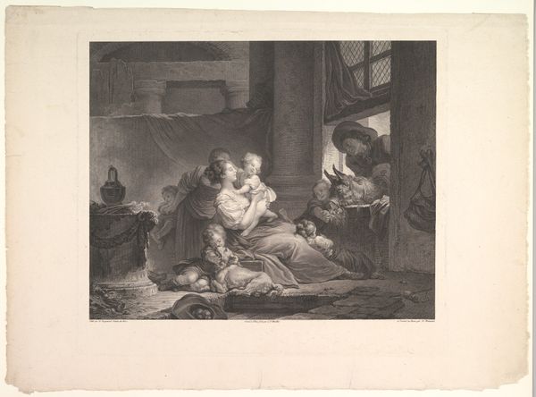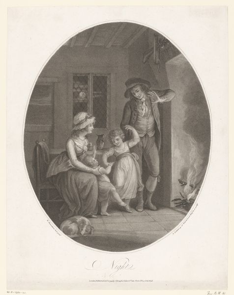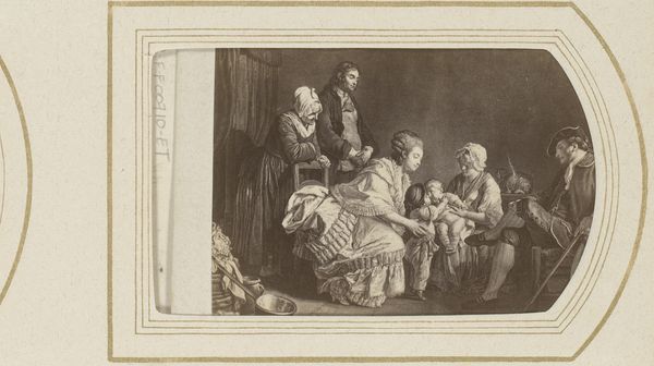 Curator: Look at this wonderful scene, a lithograph by Honoré Daumier titled "Reading the newspaper in the family circle", created around 1835. It's currently held at The Art Institute of Chicago. Editor: My first thought is how closely knit and intimate the image feels, though with some formality. There is almost a circularity to the arrangement of figures, which pulls you into their collective attention. Curator: Indeed, Daumier was commenting on the increasingly important role of newspapers in shaping public opinion and its introduction into domestic settings. This domestic reading becomes almost a ritual. The family seems gathered, attentive, under the spell of the printed word. It's a telling snapshot of the era. Editor: Yes, but consider too the symbolic weight Daumier gives to light and shadow. The father figure holding the paper seems illuminated, positioned to deliver the 'news' which emanates towards other figures in dark to light contrast. It gives him a position of authority within the family that’s undeniable and contrasts starkly with, say, the child in white. Curator: I agree, but he’s also making a broader point about social power. Daumier consistently engaged with the political and social realities of his time through his art, very much aligned with the spirit of Romanticism. Newspapers, like this family circle, are essential units through which societal norms are formed and challenged. Editor: True. What do you make of the sleepy dog, at the feet of the person reading the paper? Its presence lends to this very human element, but also a touch of cynical commentary perhaps? Like they’ve all heard it before… Curator: I see the dog as another element grounding the image, underscoring the idea of home and familiar routines even amid the influx of outside information. A counterweight to this formal, but serious, delivery. Editor: It all comes together in a complex tapestry. The symbols, light play, the arrangement, provide layers of readings on how the media enters society’s intimate lives. Curator: Indeed, a powerful lithograph and commentary from Daumier on domesticity, family roles, and the emergent power of media in society. Editor: A brilliant lens, offering insight into this important intersection of social and psychological currents, a visual depiction of the absorption of current events through a specific familial lens.