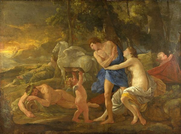 Editor: This painting, "The Infant Bacchus Entrusted to the Nymphs of Nysa; The Death of Echo and Narcissus," is by Nicolas Poussin. The composition is so carefully arranged, almost like a stage set. What do you see in the way Poussin uses form and color here? Curator: Observe how Poussin has articulated the scene. The formal elements—the disposition of figures, the carefully balanced light and shadow—all contribute to a sense of classical order. Do you notice how the figures are arranged in distinct groups, almost like sculptures in a frieze? Editor: Yes, I see that now, each group tells a story. It’s so controlled. Curator: Precisely. Note how the artist uses color to direct our eyes and underscore relationships between these groups. The formal harmony mirrors the intellectual and philosophical concerns of the time. What do you make of the bright red in the scene? Editor: That careful balance of color really enhances the composition.