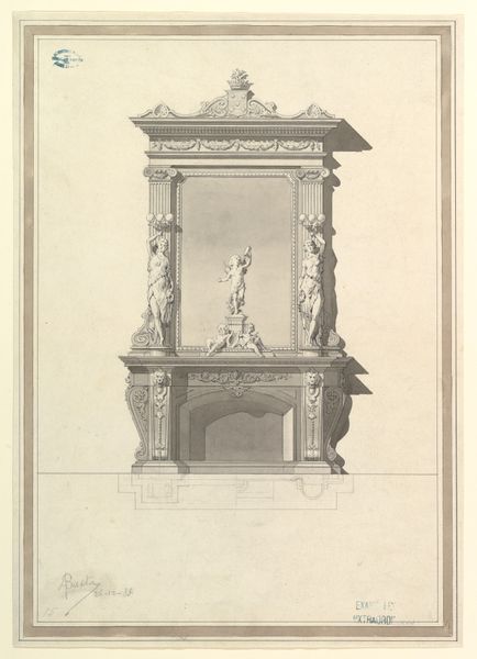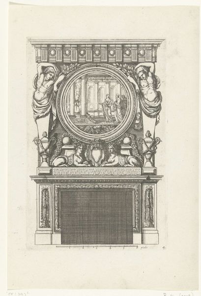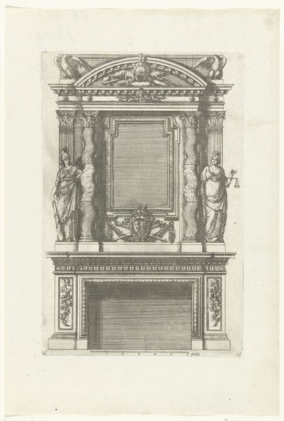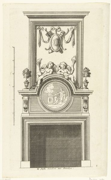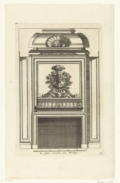Curator: Right now, we’re looking at an engraving by Pieter Schenk called “Onderboezem met veertien vazen en theepotten,” made somewhere between 1680 and 1700. It’s a fireplace design, but the title… Well, it translates to “Bust with fourteen vases and teapots”. Quite specific, isn't it? Editor: My immediate feeling? A sense of serene opulence. The meticulous lines create such formality. It reminds me of powdered wigs and hushed drawing-room conversations! I can almost smell the beeswax and hear the faint harpsichord music. Does it give you that vibe too? Curator: It does indeed, with its very precise architectural design rendered in fine lines and baroque flourish. Remember that the fireplace was very much a central status symbol, a focal point of domestic life in that period, an announcement of wealth and refined taste to any visitors. Editor: I’m struck by how busy the surface is, and how orderly the geometric ornamentation manages to coexist. There's a classical bust placed so centrally, which somehow personalizes this imposing architecture, it looks alive atop what might be some stern fellow’s house! I would never imagine teapots decorating such an ornate surround… it feels bizarre! Curator: Well, teapots were coveted items themselves, signifiers of wealth. Think about the social rituals evolving around tea drinking then, and the East India Company trading routes – so this display on the mantelpiece elevates the fireplace into something more than just heating apparatus. Editor: Do you feel that tension, that push-pull between ostentatious display and real practical use, adds layers to our reading? Or even its visual impact, maybe the severity keeps things restrained… ever so slightly. Curator: I do. It reflects the societal anxieties around display. But also the role these designs played in the dissemination of fashionable ideas. Engravings such as this acted almost like catalogues, showing potential clients the kind of designs a printmaker, like Schenk, could deliver. Editor: So, almost interior design porn, centuries before Instagram? Showing off potential grandeur, that is. Curator: (laughing) Precisely! Now when I look at it through that lens, I am amazed at the ambition. A potent mix of self-promotion and social commentary contained in those tightly packed lines. Editor: What’s intriguing to me is the feeling of domestic theater, which this whole assemblage creates: a backdrop for lives lived both intimately and publicly. Thanks to Schenk, we're invited right inside.