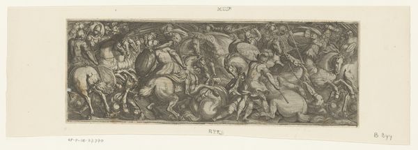 Editor: So, here we have *Fighting Horses*, an engraving from around 1511-1575, created by an anonymous artist. There's such dynamic energy in this composition, so much chaotic movement. What socio-political context might have inspired such a piece? Curator: That's a great question! This period, the Renaissance, saw the rise of humanism and a renewed interest in classical antiquity. The dynamic energy you observe may reflect the era’s societal upheavals, like the many wars of the time. Think about how powerful ruling families used art to project authority. Does this image reinforce or challenge their dominance, and how would such a piece be viewed by the common person? Editor: I see what you mean! If wealthy families influenced art production, wouldn’t they commission imagery that emphasizes their strength, like imposing equestrian portraits of leaders? These horses are certainly powerful, but they seem to reflect discord more than anything. Curator: Exactly. And how was the "public" defined then? Who would have access to such prints, and what messages were they receiving from them? Note also how the form refers to art historical themes of conflict or struggle. Can you relate this print to classical art such as friezes and relief carvings of the battles of gods? Editor: Now I see how that classical connection influences this work, even as the artist subverts any clear message of victory or power. Considering it's a print, more people likely had access, but its interpretation still depended on their own circumstances. Curator: Precisely. Reflecting on the public's experience of this work, what lasting impressions remain regarding how the arts communicate themes of conflict during this important period of history? Editor: It makes me realize that even something as seemingly straightforward as a group of fighting horses carries complex social and political weight, depending on who’s looking at it, and *when*. Thanks! Curator: A fruitful investigation of the cultural complexities underlying works of art. Well done.