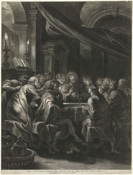Curator: Looking at this engraving of "The Last Supper", made sometime between 1581 and 1633, after Theodoor Galle. You are immediately struck by the lighting aren't you? Editor: Absolutely, it's like a stage production, that stark illumination... almost unsettling given the context. The deep shadows and intense light pinpoint certain areas. A moment frozen just before... Curator: The medium of engraving really emphasizes that dramatic contrast too. The process involves meticulously carving lines into a metal plate, applying ink, and then pressing it onto paper. It’s a laborious and highly skilled craft, each line dictating how light and shadow will eventually appear. And the distribution of labor would’ve been very divided on a project like this. Editor: You can almost feel the weight of the labor. Speaking of feeling, there's also a raw emotional energy; betrayal hangs heavy. That gathering storm brewing indoors mirrors that ominous moon shining outside. There's something intensely private playing out. It almost feels claustrophobic. Curator: Well, remember that prints like these circulated widely. The democratization of images allowed for ideas, even revolutionary ones, to permeate society more rapidly than ever before. Religious scenes like this, produced in multiples, brought theological concepts to broader audiences. Also, that focus on linear perspective became a technique and trope onto itself to create depth for increasingly more secular patrons of art. Editor: A crucial detail. It's odd how accessible and relatable their emotions become via distribution to private ownership. I am quite drawn to those faces - I see such complex states there... fear, certainly denial and dread... you are able to read into it intimately even while feeling distanced as the viewer. It makes it strangely potent. Curator: And it underscores the inherent contradiction, doesn't it? Art, even when dealing with faith, became a commodity, circulating in increasingly capitalist markets. This particular print showcases how devotional images became part of a larger system of production and consumption. Editor: True, and yet, the vulnerability on those faces transcends commerce. They bring something human out of the divine narrative; almost too good to be sold so commonly, it’s moving and perhaps even a bit haunting, given that history and distribution of its images. Curator: The image’s narrative power then isn't simply due to its artistic merit, but rather how the mode of its production helped establish the themes so ingrained into western popular imagination to this day. Editor: A fitting observation to appreciate an era defined both by expansion and contraction—a tension echoing still within those expressive eyes today, through time and all those mechanically produced.