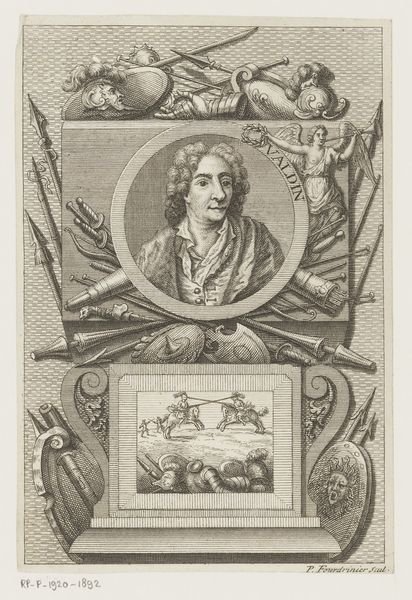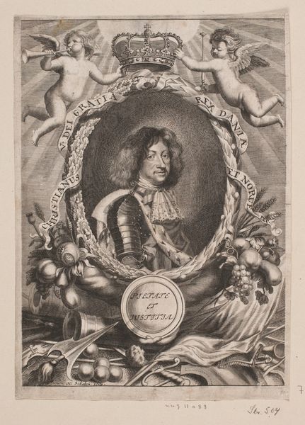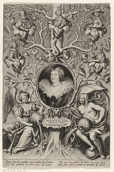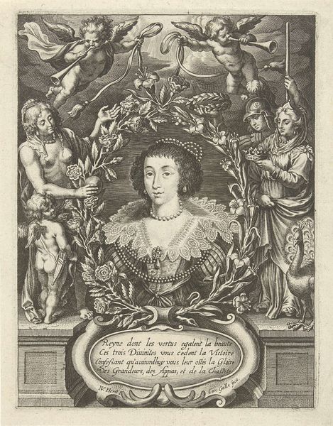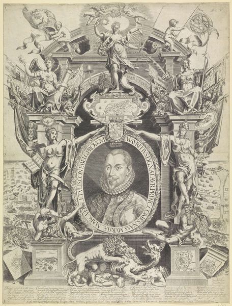 Curator: Let's consider this striking print from 1624, a portrait of Louis XIII by Crispijn van de Passe the Younger, housed here at the Rijksmuseum. It's rendered with incredibly fine lines through engraving. Editor: My immediate sense is one of immense grandeur and symbolic weight. It's more than just a portrait; it's a carefully constructed display of power, teeming with allegorical figures. Curator: Indeed. Considering Passe's process, the creation of such an intricate image demanded not just skill but a system. Think of the economics involved—the cost of the copperplate, the labor for engraving, and the distribution networks required to spread the image. And then how prints were becoming important propaganda! Editor: Precisely, that brings us to symbolism. The angelic figures holding a crown above Louis, the lions and horses surrounding him—they evoke classic notions of strength, divine right, and righteous rule. And the detail devoted to representing fabrics such as drapery, as well as the emblems hanging around Louis. Everything feels carefully chosen to bolster his image. Curator: From a material standpoint, the print offered a scalable means of distributing imagery. It moved political messaging out of painted commissions for the elite, into much broader and emerging markets for art. Consider how that affects the perception of what 'art' can do, especially concerning politics and propaganda. Editor: Good point. Notice the subtle details within the borders too—various characters that seem to act as ancestors that support and uphold Louis' kingship. The imagery seeks to establish a lineage, a historical and almost mythical continuity that justifies his reign, going beyond mere earthly power. Curator: It really does give a lot of insight on print as political engine and as a means of artistic exploration. I keep returning to the fine web of engraved lines, thinking about its reproducibility in comparison to painted, one-of-a-kind artworks. Editor: And I am continually reminded of the conscious crafting of imagery to resonate with specific cultural understandings and even deep-seated emotional associations of both the king and the figures representing and surrounding him. The visual vocabulary chosen here seems extremely deliberate.