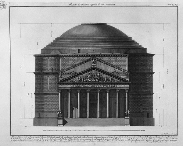 Editor: This is Giovanni Battista Piranesi’s “Demonstration of the exterior and interior of the window shows the bell of the Temple of Vesta,” an engraving that meticulously diagrams architectural elements. I'm immediately struck by the contrast between the precision of the lines and the evocative, almost theatrical feel. What can you tell us about the broader historical context of this work? Curator: Well, this image offers a fascinating window – pun intended – into the Neoclassical fascination with Roman antiquity. Piranesi wasn't just documenting architecture; he was actively shaping the public's perception of Rome. Consider how engravings like these circulated widely, influencing architectural styles and even fueling a kind of "Roman fever" among European elites. To what extent do you think this idealized representation shaped architectural movements of the time? Editor: That's a good question! It makes me think about how carefully he selected the details, amplifying certain elements while possibly overlooking others. Is this more about archaeological accuracy or promoting a specific vision of Rome's grandeur and authority? Curator: Precisely. It's about crafting a narrative. Piranesi wasn’t a passive recorder. He actively reconstructed and reimagined Rome. Think about the role museums and patrons played in popularizing a vision of an idealized past. Where does reality begin and idealized reconstruction end? How much of what we think we know of this period comes filtered through similar presentations and interpretations? Editor: So, this image is less about technical drawing and more about constructing an idea of Rome for a specific audience. Fascinating! I never thought about the engraving being such an active participant in shaping architectural trends. Curator: Absolutely. Seeing Piranesi's engravings through that lens can offer surprising insights into the complex interplay between art, history, and power. There’s so much more to see in what seems, at first glance, simply a technical drawing. Editor: I’ll definitely look at these kinds of architectural prints differently from now on!