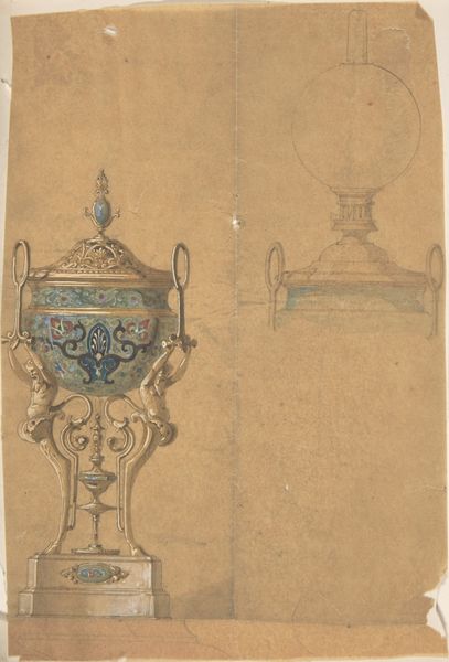 This design for an oil lamp and lid was likely made in France. The design on paper offers insights into the intricate processes and artistry involved in crafting luxury goods. The use of watercolor and graphite on paper allows for detailed renderings of the lamp's form, the translucent glass, and the delicate porcelain body. Note the hand-painted scenes and gilded accents. These details speak to a workshop setting where specialized artisans would contribute their skills. The production of such an object was collaborative. Considering its function, it's easy to overlook how much labor was required to produce light in an era before electricity. Objects like this weren't just decorative; they were essential to daily life. Designs like this reflect social stratification. Only the wealthy could afford such elaborate pieces, highlighting the role of craft in materializing class distinctions. By examining the materials, making processes, and cultural context of this design, we can appreciate the deep connections between art, craft, and society.