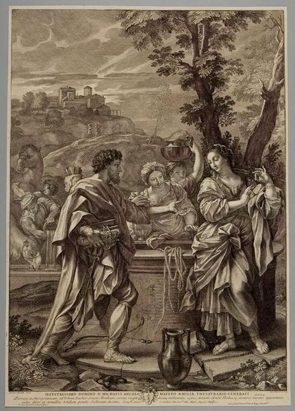 Editor: This is Gianantonio Lorenzini’s "Calling of Andrew," currently residing at the Harvard Art Museums. The composition feels very dynamic, almost theatrical. What do you see in this piece, particularly in terms of its visual structure? Curator: The piece, viewed through a Formalist lens, presents a fascinating study in contrasts. Observe the curvature of the arch at the top, subtly mirrored by the shoreline below. The artist’s line work uses shadow to divide the composition, creating depth and guiding the viewer’s eye. Editor: So the curved lines and strategic use of shadow are key to understanding the work's impact? Curator: Precisely. The dynamism you noted is a direct result of these structural choices. Consider how the figures are arranged; their poses, too, contribute to the overall sense of movement and drama. What do you make of their placement? Editor: The figure in the boat seems to be working, while another kneels before Christ. The contrast in posture is certainly striking. I hadn't considered how much the artist played with the geometry. Thank you.