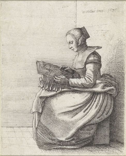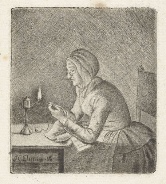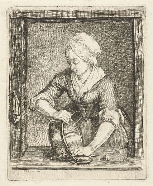 Pieter de Mare created this print called Kantmaakster in the late 18th century, using etching and engraving. During this time, the Dutch Republic was undergoing significant social and economic changes. The print depicts a woman engaged in lacemaking, a common occupation for women during this period. Lacemaking provided women with a means of economic independence, but it was also a labor-intensive and often poorly paid job. The woman’s downcast gaze and the modest interior suggest a life marked by both diligence and constraint. This print offers insight into the gendered division of labor and the economic realities faced by women in 18th-century Dutch society. It reflects societal expectations around femininity, labor, and domesticity. De Mare's image prompts us to consider the lives and experiences of women whose contributions to the economy were often undervalued and overlooked.