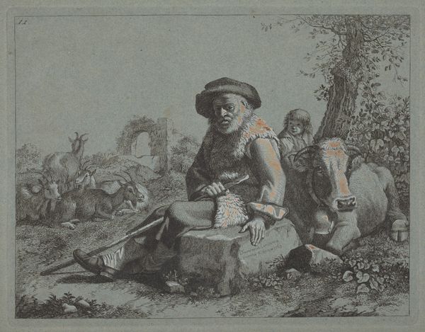 This reverse copy from "Les Caprices" series presents a scene dominated by stark contrasts, achieved through fine, parallel lines that define form and texture. The composition leads your eye from the rugged, striated tree on the left, across the weary peasant, to the distant cliff. Notice the use of line: it not only describes objects but creates depth and mood. The dense hatching on the tree and the peasant's clothing versus the sparser lines in the background suggest a hierarchy of importance, focusing our attention on the human figure and the immediate foreground. The peasant, burdened yet resolute, becomes a symbol of the toils of rural life, depicted with a sense of stoic dignity. The artist uses a structural approach to reveal the essential forms and underscore the thematic content. Consider how the contrast between light and shadow emphasizes the rough textures and solid volumes. This engraving functions as a meditation on human endurance.