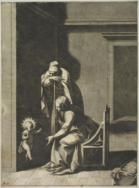 Raffaello Schiaminossi made this engraving, “Maria leert het Christuskind lopen,” which translates to “Mary teaching the Christ Child to walk,” around the turn of the seventeenth century. Here we see an intimate domestic scene, Mary is depicted teaching baby Jesus how to take his first steps, with Joseph watching over them. Made in Italy, this print reflects the strong influence of the Catholic Church. Religious imagery served not only as a source of personal devotion but also as a tool for religious instruction. Prints such as this one played a crucial role in disseminating religious ideas and values to a wider audience. Historians rely on an understanding of the period’s religious and social context to fully understand the print’s meaning and significance. Researching the history of religious orders and their patronage of the arts can provide additional context, as can the study of popular piety and devotional practices. Ultimately, understanding the social and institutional context is essential for a deeper understanding of the artwork’s significance.