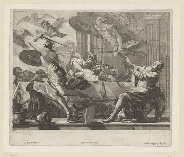 Curator: "Aritmetica," an engraving from around 1663-1716, attributed to Jacques-Antoine Friquet de Vauroze. It has such a balanced composition, despite all the figures present. What strikes you first about it? Editor: Well, seeing the Roman numerals and the classical setting, it seems to portray knowledge and authority. How would this piece have been received by the public at the time? Curator: That's insightful. Think about the rise of academies and the scientific revolution. "Aritmetica," depicting Papirius, a Roman censor, in a rather staged intellectual setting, presents a very particular vision of power. Who had access to learning, and therefore, power, in this era? Editor: Presumably, only a select few... those of wealth or noble birth. Was this print intended for them specifically? Curator: Likely so. Consider its function as a marker of status. Possessing knowledge, documented here in print, became a signifier of belonging to an elite, educated class. The architectural backdrop further emphasizes their social and cultural world, don't you think? How does that influence the reading of the subject matter? Editor: The columns give it an official feeling, as if the work of documenting knowledge is essential to maintain society and power dynamics, or even that it represents them. Curator: Exactly. This engraving highlights how institutions not only shaped artistic production, but were equally embedded with the era's specific ideas about knowledge and those who could access it. It's not just about arithmetic, it's about who gets to define it and for what purpose. It reveals something profound about the social currency of intellect during that period. What are your thoughts? Editor: I hadn't considered the implications about social structures inherent in its setting. I guess art isn't just art, but a political reflection as well.