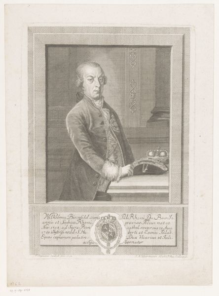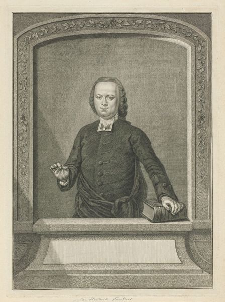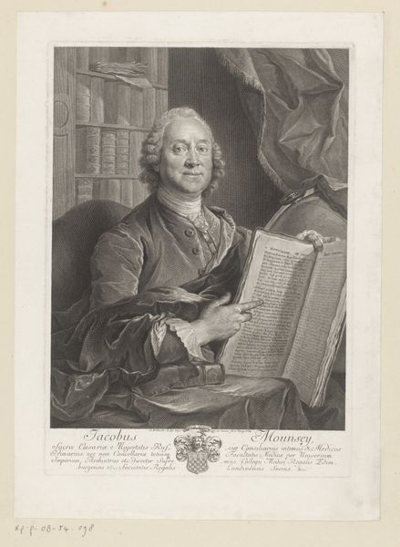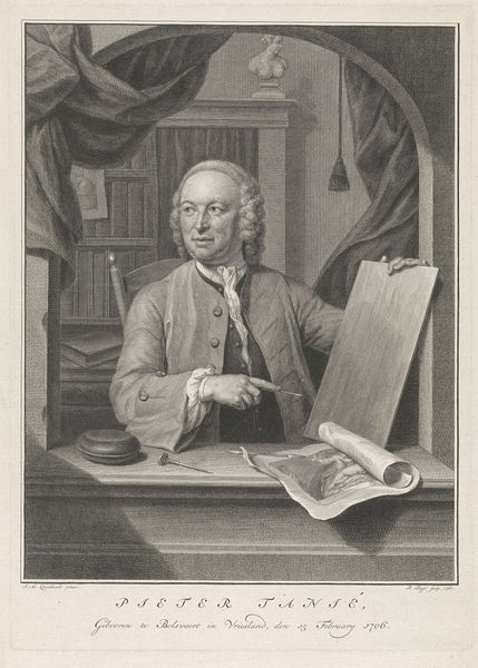 Curator: Gaze upon this finely wrought engraving by Jacob Houbraken, dating from around 1771 to 1773. It's a portrait of Nicolaas Simon van Winter. Editor: My initial impression is one of calm, studious authority. It feels like peering into the private domain of a scholar, the kind of enlightened gent who pens verses between astronomical observations. Curator: Indeed. Notice the deliberate inclusion of objects – the globe, the books, the telescope – all signifying a life dedicated to intellectual pursuits. The placement of those objects firmly situates him among the burgeoning scientific community of his era. Editor: Absolutely, those weren't just props, but rather signals of class and belonging within a very particular societal moment. Also, the delicate lines create a marvelous sense of depth. It's funny, isn't it, how this detailed cross-hatching almost gives a shimmer to his silk jacket, and how his wispy wig seems almost tangible! Curator: Engraving has that capacity, I think, to conjure the illusion of texture where there is only line. It makes this quite intimate, though official in presentation. What I find compelling is the artist's attempt to capture, not just his likeness, but some essential quality of the man's mind. It seems they wished to illustrate his essence. Editor: But is there also a level of artifice there? The gaze directed, the hand gesturing as if mid-thought. It's a performance of intellect, one carefully constructed for posterity – a perfect display of a patriarchal intellectual figure, in my opinion. Curator: I wouldn’t refute that entirely! It’s clearly meant to be an elevated and dignified portrayal, but perhaps artifice is itself part of how we express and define ourselves. Maybe Nicolaas Simon van Winter understood this too? Editor: Perhaps, indeed. Looking at this work, I am reminded that even portraits of historical figures exist in a complex dialogue with the values of their time and our own, as they’re perceived from the perspectives that we occupy now. Curator: That’s such an eloquent thought, really! Considering all things, and how it connects with the zeitgeist, I’d concur that portraits such as these invite constant re-evaluation through contemporary perspectives, encouraging engagement with art's impact in society across centuries.