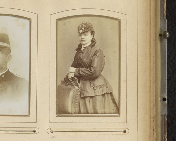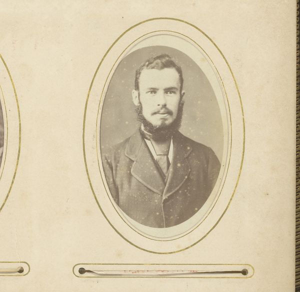 Editor: This is an albumen print titled "Portret van een man met bakkenbaarden," which translates to "Portrait of a man with sideburns." It's a photograph from somewhere between 1860 and 1900. There's a real stillness to the image, a kind of quiet confidence in the subject's posture. What strikes you most when you look at this? Curator: I’m drawn to the recurring symbolism inherent in portraiture of this era, how it speaks to aspiration and identity construction. Think about the chair: What does it represent here? Editor: Status, maybe? A bit of domesticity? Curator: Precisely. It suggests stability, access, even ownership, subtly reinforcing a narrative. What do you notice about his clothing? Editor: Well, he’s certainly dressed formally - vest, bow tie, suit jacket. It signals respectability. Curator: It is very carefully considered: each accessory acts as a signifier, speaking volumes about societal values. What kind of memory or feeling does his specific attire conjure? How do sideburns play a part in conveying a specific image? Editor: That's fascinating - seeing it all as symbolic choices contributing to a larger statement about who he is or, perhaps, who he wants to be perceived as. It makes you wonder how much of ourselves we carefully curate for the world to see, even today. Curator: Indeed. We see cultural memory operating within seemingly straightforward imagery. That makes this image deeply powerful.