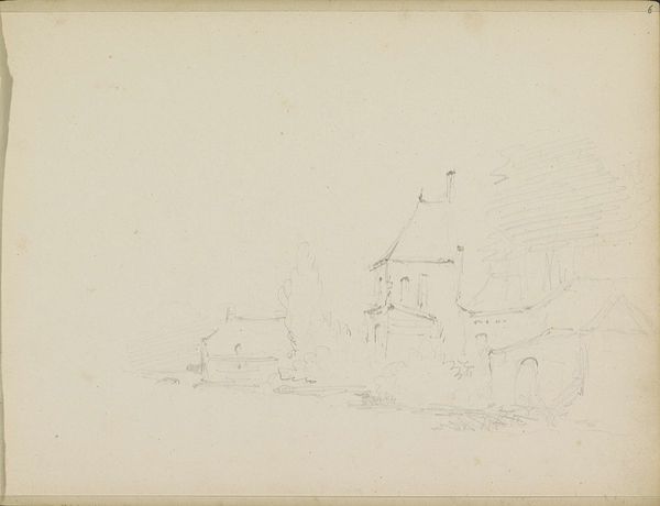 Editor: So this is Cornelis Springer's "Gezicht in de Vissersbuurt te Harderwijk," likely from the 1860s, a pencil drawing held at the Rijksmuseum. It's incredibly sparse, almost ghostly. What do you see in this understated cityscape? Curator: I see a fascinating study in memory and the ephemeral nature of place. The almost sketched-in quality, especially on the left page, speaks to a location partially remembered, or perhaps fading from collective memory. Notice the architectural details of the buildings. Do they suggest any particular time, any echoes of the Dutch Golden Age? Editor: Well, it's labeled as being in that style, but the details are so faint, it's hard to grasp what architectural features are being highlighted here. Curator: Precisely! And perhaps that's the point. Springer isn't merely depicting Harderwijk, he’s capturing a feeling, an impression. The figure walking down the street—almost disappearing into the architecture. Do you feel a certain symbolic weight, a reminder of how individuals are both shaped by, and contribute to, the visual narrative of a city? Editor: I do, especially as you mention that idea of a ‘visual narrative.’ The lone figure becomes part of this… almost melancholic… street. So is the blank page meant to echo loss? Curator: Loss, transition, the unwritten future…consider how empty space functions in a symbolic way. It prompts reflection and questions about what *isn't* represented. What would you imagine there, what is the viewer meant to imagine being added to the blank page on the left? It challenges our understanding of not just art, but history itself. Editor: It definitely shifts the meaning of a seemingly simple drawing. It gives me much to consider in thinking about space and symbol. Curator: Indeed, an image whispers volumes when we consider its symbols.