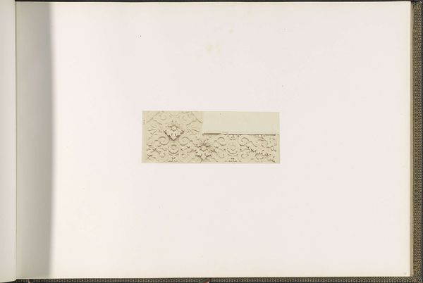Editor: So, this is a photograph by Edouard Baldus, circa 1855 to 1857, titled "Gipsmodel voor gevelversiering op de Bibliothèque Impériale van het Palais du Louvre" – which I think translates to something like “Plaster Model for Façade Decoration on the Imperial Library of the Louvre Palace.” It has such a formal, almost severe, look to it. What do you make of it? Curator: It’s a fascinating image, especially when considering the socio-political climate of the time. The Bibliothèque Impériale, now the Bibliothèque Nationale de France, was a project deeply embedded in the Second Empire’s ambition to project power through culture and knowledge. Baldus's photograph isn’t just a record of ornamentation; it’s a document of that ambition. How does the classicism of the ornamentation speak to you? Editor: Well, it feels… weighty, imposing. The floral motifs feel a little forced within the rigid structure, like nature being pressed into service of the state. Curator: Exactly! The state-sponsored art of this period, particularly architectural embellishments like this, served to visually legitimize Napoleon III's regime by linking it to the perceived grandeur of classical empires. Think about the placement of the Library within the Louvre Palace; how does that location contribute to its political message? Editor: I suppose placing it there, next to artwork from history, reinforces the image of continuous power and legitimized rule, right? Curator: Precisely. This facade, rendered in plaster for this photographic study, would be eventually executed in stone. And that reminds us that photography itself was becoming a tool to catalogue, promote, and control the narrative around these state projects. Editor: That’s a lot to unpack. I initially just saw a picture of fancy molding! It is intriguing how it all interrelates though. Curator: Indeed. And considering the photograph's role, both within Baldus's wider practice, and as a record of the Imperial regime adds crucial context. I learned some today too! Thank you.