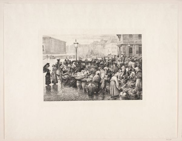 Curator: This is Edvard Petersen's "Højbroplads," an etching dating from 1860 to 1880. Editor: My initial impression is one of dense, bustling energy. The print’s gray tones evoke a wet, overcast day, emphasizing the close-knit figures huddling together amidst a very busy market scene. Curator: Absolutely. Petersen captures the vibrancy of daily life, specifically the economic roles of women as vendors and consumers. Considering that urbanization changed roles in Danish society, we can view this scene as capturing gender roles that reflect cultural history in transition. Editor: Yes, and structurally, notice how the tight composition focuses our eyes on the marketplace, utilizing an array of repeated shapes—the heads of the figures, the circular forms of the baskets and goods, even the repetition of vertical lines like those in the buildings in the background all pull the viewer into the work. Curator: Those compositional elements provide the order and dynamism we also see within social contexts. I’m curious about the obscured faces—we only get partial glimpses of most of the figures, reminding me of the restricted position of women. We see a glimpse into their confined spaces through commerce within societal structures. Editor: That ambiguity could also point to the power of etching, a printing technique that emphasizes detailed linear work. We may never truly "see" any face completely; instead, we interpret their role within the network of etching's linear framework. Curator: True; the limitations of visual clarity perhaps reflects a constrained visual reality in portraying lived realities in Denmark at this time. But I think by obscuring them, it draws a greater need to study their function and roles within Danish society and art today. Editor: Petersen creates a fascinating picture through shape and tone and form that demands inspection. I have new perspectives after this exchange. Curator: I agree, having reviewed "Højbroplads" again with form as a cultural context has brought to light different perceptions about roles today.