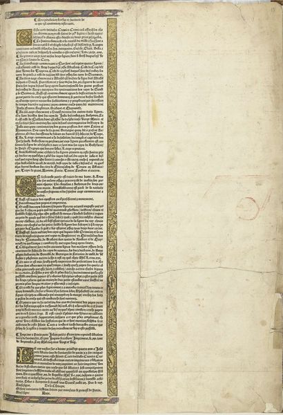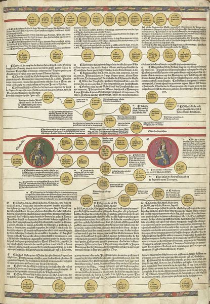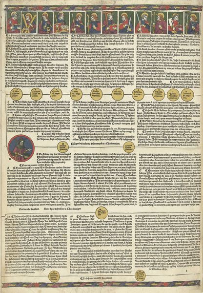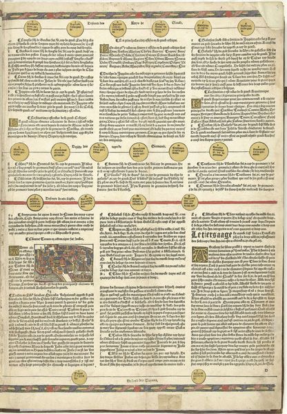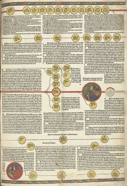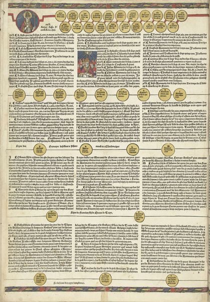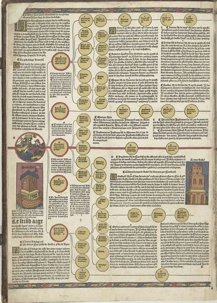Editor: Here we have a page, "Cronica Cronicarum (...), blad 6 recto," thought to be from sometime between 1521 and 1529 by an anonymous artist. It seems to be a woodcut print on textile. It's fascinating how information is organized. What are your initial thoughts about this page? Curator: Looking at this piece through a materialist lens, the woodcut is really interesting. We're seeing the convergence of artisanal skills and early industrial processes. The textile support speaks to the book's intended use – not just as an art object, but as a functional item likely intended for heavy handling. Editor: That makes sense. I hadn't thought about the textile's implications. It is the ‘enduring’ and functional character in comparison to modern disposable prints. Does the choice of materials imply something about the intended audience? Curator: Absolutely. This wasn't mass-produced in the modern sense, even though printing allowed for greater distribution than manuscripts. Consider the labor invested in creating the woodcut, preparing the textile, and the very act of printing. Who could afford such an item? How did they intend to use this "chronicle?" Was it a tool for governance, scholarship, or religious practice? Editor: So, by analyzing the materials and process, we can infer aspects of its socioeconomic context. Is there anything else you notice about how the information on this page is structured that we could unpack from a material perspective? Curator: Consider the circles and lines; they were made from wood that was painstakingly carved by a real person, so that this same real person could set the text, also carved in wood. What were the limitations inherent in that process? Does the circular nature impact legibility and usability in any significant way? Editor: It's less streamlined than a modern printed page; the imperfections of the woodcut give it character, but also indicate limitations on reproducibility and dissemination of knowledge. This brings more weight to your materialist analysis. I hadn't considered that perspective at all before. Curator: Exactly. It's all about examining the labor and materials that went into this object.