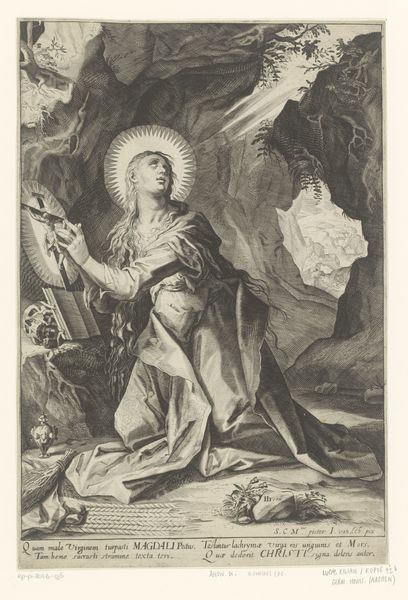 Jean Couvay made this print of Saint Mary of Egypt sometime in the mid-17th century, using an engraving process. This involved meticulously incising lines into a metal plate with a tool called a burin, a labor-intensive activity, requiring great skill and precision, similar to other forms of highly skilled craftwork. The quality of a print like this depends on the evenness of the ink, the pressure of the press, and the fineness of the lines etched by the engraver. Notice how the varying density of the lines creates tonal depth, with a velvety dark curtain contrasting with the saint's luminous skin. The medium lends itself to intricate detail, seen in the rendering of the saint's dress, hair and jewelry. The final print is more than just an image; it represents a transfer of skill, labor, and material resources. It is a multiple, designed to spread ideas widely, far beyond a single hand-painted picture. By appreciating the material processes involved, we can better understand the social and cultural value of prints like this one, and the labor that went into its production.