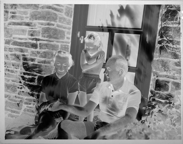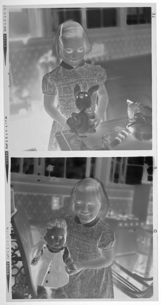 Curator: This is an untitled work by Martin Schweig, a photographic diptych presenting two medium format images of a young girl in a domestic setting. Editor: Whoa, it’s like looking into a ghostly memory. The stark contrast gives it this eerie, dreamlike vibe. Curator: Indeed. The negative exposure emphasizes light and shadow, which heightens the formal composition in each panel. Note the carefully arranged objects, grounding the figure. Editor: It feels intimate, almost voyeuristic, but in a strangely innocent way. Like we're glimpsing a private world where imagination reigns. Curator: The artist’s choice to present it as a diptych also creates a dialogue. One panel shows her reclining, and the other shows her at play. We could say it’s a juxtaposition of stillness and motion. Editor: Makes you wonder what stories she's creating in her mind. Alright, I'm intrigued. Schweig really captured something special here. Curator: Precisely. Schweig offers a compelling glimpse into the ephemeral nature of childhood experience.