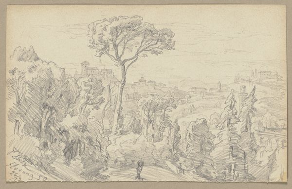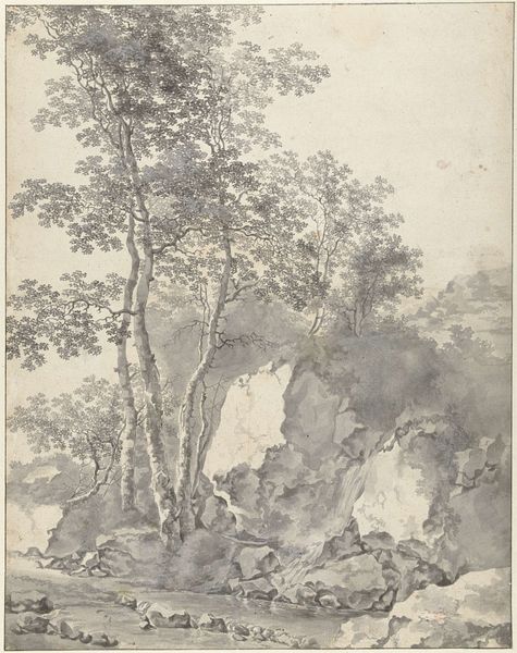 Editor: Here we have "Mountain Road with a Man and Two Mules," a pencil drawing on paper by Cornelis de Wael, dating somewhere between 1602 and 1667. It feels almost dreamlike to me, unfinished but also complete in its own way. How do you interpret this work, given its historical context? Curator: It’s interesting you call it dreamlike. As a historian, I see this less as a spontaneous creation and more as a product of specific artistic training and social expectations. The picturesque landscape, the inclusion of figures, all point to a cultural interest in the Grand Tour. Consider the market for these kinds of drawings; wealthy Europeans collected them as souvenirs. Does knowing that affect your perception? Editor: That’s fascinating. I hadn’t thought about it as a commodity. So, these drawings were like… postcards? But surely there’s something more than just documentation going on? Curator: Indeed! The “ideal landscape” was a powerful concept, shaping not just artistic creation, but also ideas about nature and national identity. Notice how the composition uses established conventions to guide the viewer's eye. It presents a romanticized, safe encounter with nature, which resonated with a particular social class. What are your thoughts on this landscape as "safe?" Editor: Safe how? It looks like a pretty treacherous climb for those mules! Maybe safe for the *viewer* because it’s just a drawing? I guess it is carefully composed to avoid being too rugged or threatening. Curator: Exactly! And understanding this reveals how art participated in shaping societal values and experiences of travel, leisure, and even class distinctions. What did you learn from seeing it from this lens? Editor: I learned to question the inherent value we assign to "nature" and to consider how power dynamics are always at play, even in a seemingly simple landscape drawing. Curator: Precisely, and I, how vital initial impression, even “naïve”, shapes further historical enquiry!