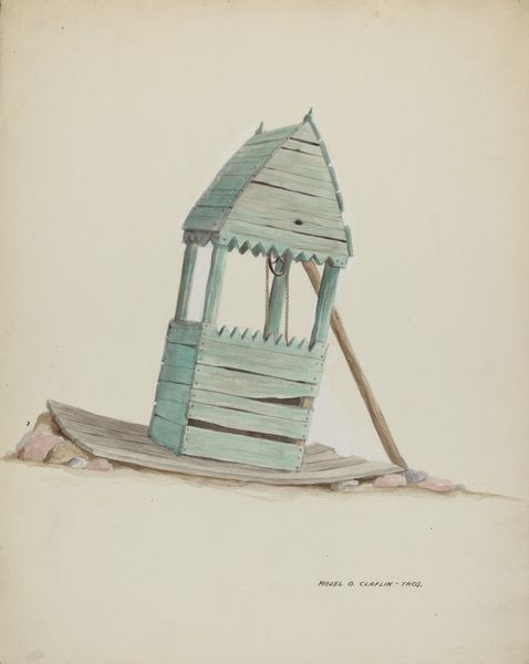 Editor: So, this is Angelo Bulone’s "Zoar Bird Cage," from around 1939. It's watercolor and coloured pencil. There’s something kind of sad and still about it, almost like a dollhouse. What do you see in this piece? Curator: I'm so glad you said that, because I too felt this weird tranquility in its architectural lines and restrained palette. For me, this drawing operates like a memory—not quite there, fading at the edges, but full of potent nostalgia. I wonder, does it bring up for you a personal memory as well? Editor: A little. I used to have a parakeet when I was little. But the details here are so precise, it feels like a very specific birdcage. Curator: Absolutely. It's a portrait of a particular object, carefully rendered. Angelo Bulone has somehow managed to create an atmosphere through such technical observation. He really understood what was unique about it: do you notice any quirks about its design, maybe its 'personality' if you like? Editor: I see what you mean. It’s got these little arched windows on the side; they’re almost Gothic. The whole thing is more ornate than I would expect for a birdcage. Almost architectural. Curator: Exactly! It's elevating this functional object into something grander, isn’t it? Maybe suggesting we should pay closer attention to the small things around us? It whispers, "Look closer." What will you be looking at more closely today after examining Bulone's creation? Editor: I think I’ll notice the details in ordinary things. And appreciate the kind of quiet attention an artist can bring. Thank you! Curator: And thank you for allowing me to relive one of my favorite images in the gallery.