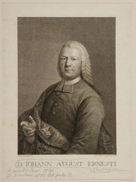 Editor: This is a portrait of Louis Hideux by Pierre Drevet. The tight framing and oval border give it such a formal feel, but it also feels intimate. What symbols or meanings do you see embedded in this image? Curator: The book in his hand, the Latin inscription, his robes—these are all carefully chosen symbols. They point to Hideux's identity as a scholar and church leader. The portrait immortalizes his intellectual and spiritual authority for future generations. What emotions do these symbols evoke in you? Editor: Mostly a sense of respect, almost reverence. It's a powerful declaration of his position. Curator: Yes, and consider how Drevet used light and shadow. It emphasizes Hideux’s face and book, as if illuminating wisdom. Each element is a deliberate choice, contributing to the cultural memory of Hideux. Thank you, I learned a lot about it today.