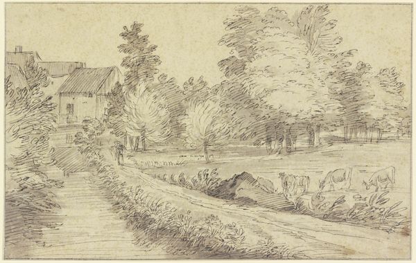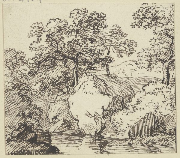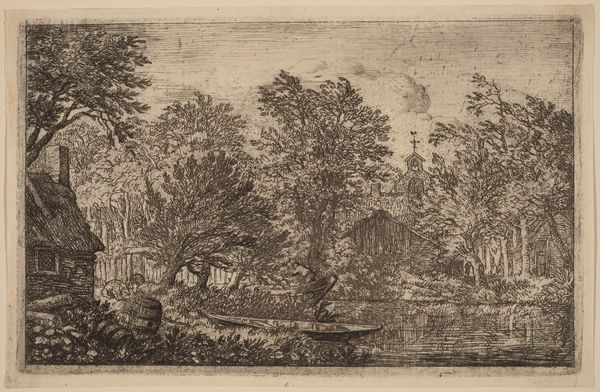 Alphonse Legros made this print, "Bank of a River," using etching, a medium that allowed for detailed lines and tonal variety. Legros, who was born in France but later became a British citizen, produced this landscape that reflects his interest in rural life and the working class. This image invites us to contemplate the relationship between humanity and nature, which was a frequent theme during a period of increasing industrialization and urbanization. The figures on the left bank may represent agricultural workers, which were a population often romanticized, yet simultaneously marginalized, during this time. Legros depicts them as an integrated part of the landscape, which lends a dignity to their existence, suggesting that rural life and labor have inherent value. The scene is quiet and contemplative; the soft, muted tones of the etching contribute to this. In viewing the artwork, we are reminded of our connection to the natural world, as well as the often-unseen labor that sustains us.