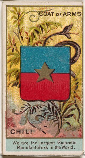Editor: This is "Rear Admiral, Chili," one of Allen & Ginter’s Naval Flags series printed between 1886 and 1891, created using watercolor and printing techniques. I am immediately struck by the warmth of the sunset colours contrasting with the cool blues of the Chilean flag. How do you read this piece within the context of 19th-century print culture? Curator: It is enchanting, isn't it? These cards were inserted into cigarette packs, acting almost like miniature, portable museums. Imagine discovering a small, vibrant world inside your pack! Consider the intent: sparking curiosity about global cultures, albeit in a commercial, simplified way. The exoticism of 'Chili' itself—distant, adventurous—is palpable, heightened by the rather romantic depiction. Does the flag, rendered almost theatrically, tell a deeper story, perhaps a marketing one? Editor: A marketing story, certainly! Do you think it appropriates or celebrates Chilean identity? Curator: That is the tension, isn't it? On the surface, it celebrates a nation. However, consider the gaze: viewed from afar, mediated through a commercial lens, it risks becoming a superficial emblem, a collectible trinket. I wonder if, ironically, such 'celebrations' fueled a desire for travel and deeper understanding... or just a quick fix of the 'exotic' with their cigarette. Editor: I did not even think about the intent being as simple as cultural exploration! I wonder, how successful were these little tokens? Curator: Oh, massively! They tapped into the human love of collecting, offering a little 'something' with the familiar vice. This particular piece highlights a fascination with faraway places… We should remind ourselves that these small artifacts tell big stories, filled with light and shadow.