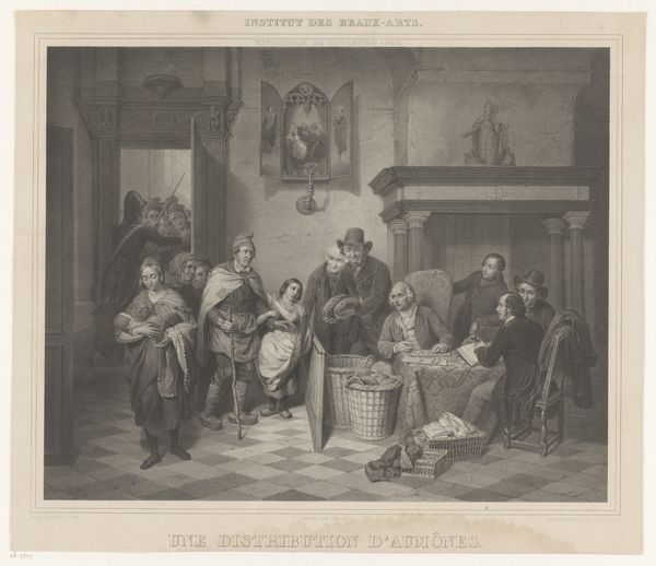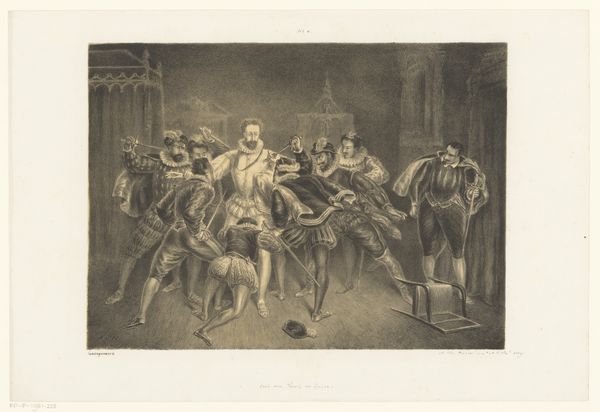 Curator: Let's take a moment to consider this engraving from the Romantic period, depicting a historical scene from the late 15th century, titled "Scholing van de zonen van koning Eduard IV van Engeland na de dood van hun vader, 1483." It's attributed to Friedrich Randel and executed sometime between 1816 and 1886. Editor: My first impression is melancholy; the stark contrast of light and shadow gives it an intense feeling of grief and foreboding. It seems to depict a pivotal moment, but a rather somber one, wouldn’t you agree? Curator: Absolutely. It’s the culmination of material anxieties surrounding legitimacy, succession and power dynamics within the royal court. You see the clear delineation in dress, indicating status. The children’s garments, rendered with a surprising amount of detail for an engraving, tell a story of privilege and yet, vulnerability. It speaks to the social conditions and material expressions of grief in that historical moment, what it meant to display power in loss. Editor: Precisely, but going further, I see it as a stark visual commentary on the patriarchal structures that dictate these children's destinies. The work invokes discourse surrounding dynastic lineage, and how children are routinely employed as mere commodities in this particular framework. Consider how the engraving utilizes conventions from medieval aesthetics while subtly subverting them through a Romantic lens, really exposing the raw political realities inherent in supposedly ordained authority. It challenges normative history-painting through attention to lived experience. Curator: Indeed. The act of engraving itself is worth noting – this method allowed for wider dissemination of this scene, democratizing access to these images. This form underscores its function as more than mere portraiture; it acted almost like visual journalism conveying historical narrative with emotive expression. I appreciate your emphasis on contemporary applications too; art provides material access to examining the very dynamics which affect identity in political and societal structures now, as well as back then. Editor: Well, looking at the long shadow cast into modernity and towards a more critically examined history and, also perhaps, the politics inherent within the framework in which we view art and historical inheritance – this has proved insightful. Curator: Agreed, this consideration regarding process coupled alongside these visual motifs prompts greater insight to historical narrative via political undertones which helps reflect the world we occupy right now. Thank you.