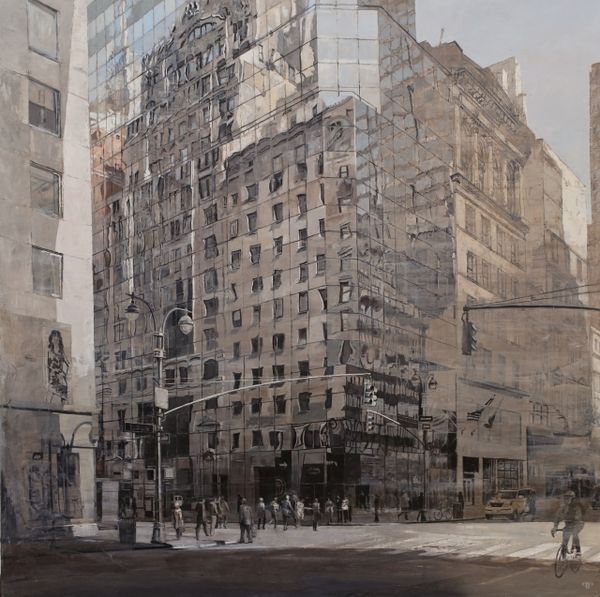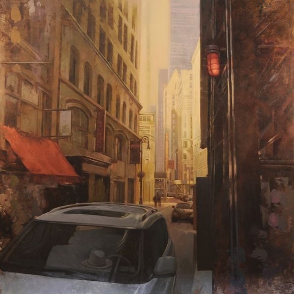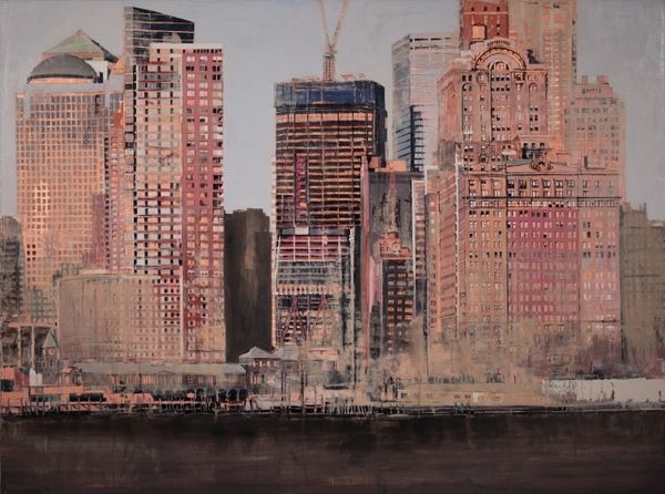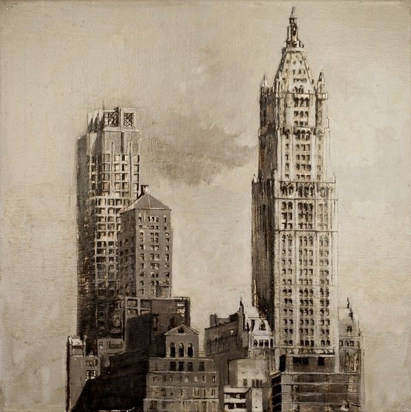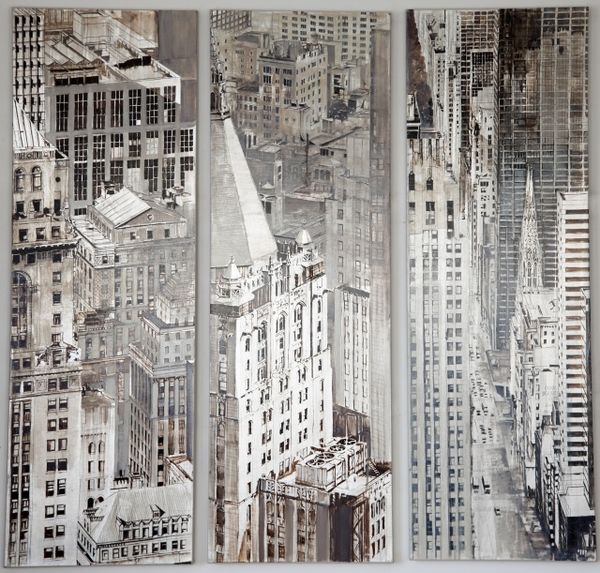 Editor: Here we have Pietropoli Patrick’s "Fifth Ave in Gold," created in 2010, an acrylic painting evoking an urban cityscape. I find the gold leaf sky juxtaposed with the gray tones of the buildings creates an almost dreamlike and alienating mood. How do you interpret this work? Curator: It's striking how Patrick uses gold – a material historically associated with wealth and power – to depict the backdrop of a hyper-capitalist space. The gold flattens the sky, almost negating any sense of depth, which brings the urban architectural forms into greater relief. I think it's significant that we have a somewhat depopulated, monumental image. What kind of commentary might Patrick be making on power structures through the contrast between the impersonal nature of urban architecture, a potent symbol of capitalism, and its inhabitants? Editor: That's a fascinating angle. It also brings to mind issues of class. Do you see a statement being made by presenting an affluent location like Fifth Avenue through such a detached lens? Curator: Absolutely. There is no real evidence of the city’s occupants. Where do we see the indicators of life? Of family? Or connection? This absence serves as a kind of social commentary. Who benefits from these urban landscapes? Do we think the gold background highlights or critiques this power? Editor: It really highlights how certain people can afford to exist, even thrive, in such expensive real estate, versus those excluded from the space. Curator: Precisely. What started as what may appear to be merely beautiful architectural depictions turns into a meditation on privilege and societal disparities when we apply that cultural context. I now wonder about urban planning itself. Editor: Exactly. I’ll never look at another city skyline in quite the same way. Thanks for this enriching exchange.