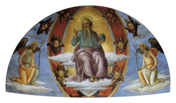 Here is an analysis of Pietro Perugino's "Pala di Sant' Agostino (Lord Blessing)." The artwork immediately presents a symmetrical arrangement: God is seated at the center of the composition, framed by an almond-shaped halo. The halo is populated by cherubic figures arranged geometrically. The artist orchestrates a visual harmony by juxtaposing the divine figure with the playful innocence of the cherubs, a common semiotic language for divinity in Renaissance art. Perugino’s linear precision and perspective is notable. The linear structure creates an idealized vision of space that echoes the philosophical precepts of the Renaissance, creating a world governed by order and reason. The subdued palette and sfumato technique contribute to a sense of ethereal calm. Perugino employs a formal visual language to explore how earthly perception may intersect with the divine. The artist’s geometric arrangement and meticulous detailing invites us to decode its structure as a symbolic representation of divine order. This interplay between form and content creates a rich canvas for interpretation and contemplation.