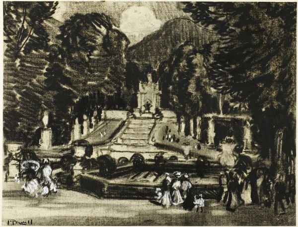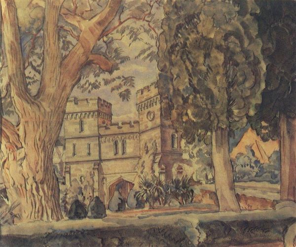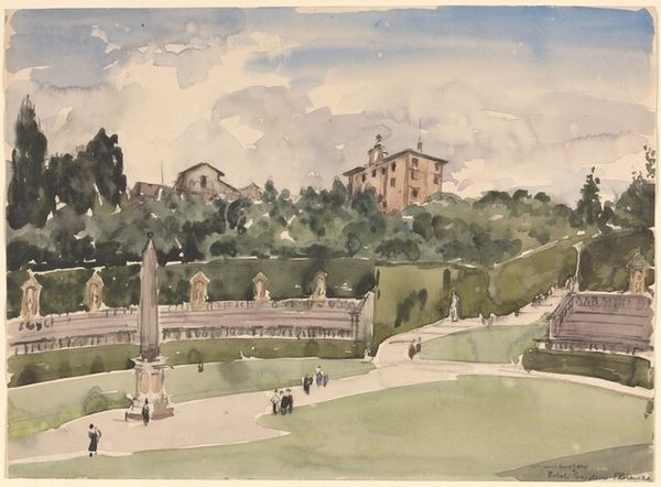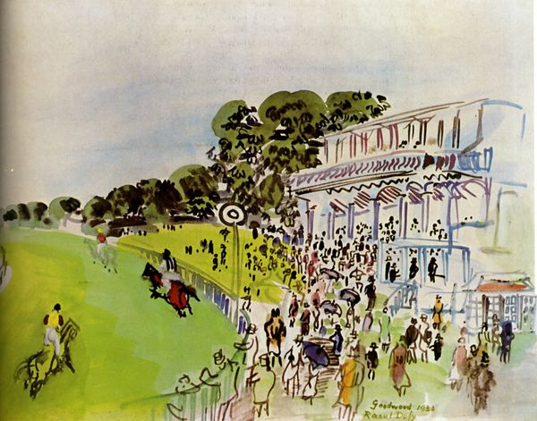 Curator: Raoul Dufy, a key figure in 20th-century art, painted "The Park of Saint-Cloud" in 1919. The acrylic painting offers a vivid look at urban landscape painting within Post-Impressionism. Editor: Oh, I get such a breezy, summery feeling from this. It’s as if Dufy bottled sunshine and a carefree afternoon into one canvas. It just has this...unburdened quality, right? Curator: Precisely. Dufy, moving through various modernist styles, uses light and color here not to mimic reality, but to construct an emotional atmosphere. There is a historical context at play as well. Post-World War I, the art world sought refuge from realism. His loose brushwork serves as an important artistic tool to communicate joy. Editor: Loose is right! The trees kind of explode with green. And that snaking golden line in the skyline--is that the Seine? I’m getting lost in the city vibes. It's as though he's saying, "Forget detail, feel the energy". Curator: It is interesting how Dufy prioritizes feeling over factual precision; however, his choice reflects post-war needs where societies tried to rebuild shattered cities, souls, and states of mind. How does the imagery used here highlight city living? Editor: I’m seeing it as a vibrant jumble – houses stacked haphazardly, smokestacks letting off that "progress" belch. You’re catching glimpses of modern life from a perfect perch – almost theatrical, you know? It all looks happy, energetic, a great place to live, and quite frankly a great backdrop. Curator: Indeed. "The Park of Saint-Cloud" captures a vital shift towards modern art, while also engaging complex cultural sentiments and hopes. Editor: Agreed! I might stroll through this scene for days if I could. I find it delightful how an artwork manages to speak about more than itself.