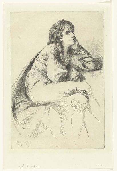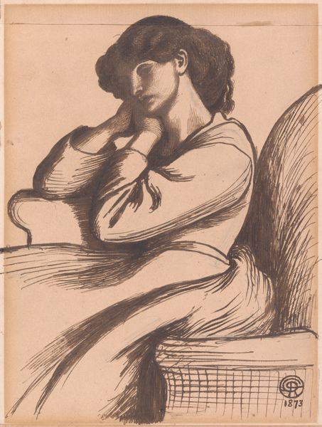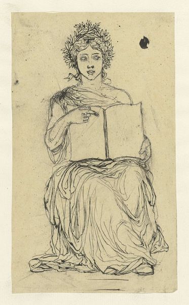 Curator: I find myself captivated by this simple drawing by Maria Louisa Catherine Cecilia Cosway, made around 1790, titled "Young Woman with a Box". It's rendered with ink on paper, a delicate portrait with the barest suggestion of Romanticism, a glimpse into private life. Editor: It’s amazing how much expression she coaxes out of a few pen strokes! There's a feeling of almost secretive intimacy here, isn't there? Like we’ve caught her unawares, deeply engrossed in whatever she's doing with that ornate little box. Curator: Yes, exactly. I think the sketchy quality adds to that feeling. It feels like a stolen moment. And while it's a fairly small piece, the way she’s placed in the center and emphasized makes you feel present in the space with her, despite being drawn with quick lines, it feels complete, thought out, intimate. I believe her art has a certain quiet power, don't you think? Editor: Absolutely, the subject being central in the drawing is fascinating! But there is something almost… performative about it as well. Cosway was, after all, very conscious of her own image, and actively worked to cultivate a public persona as an artist and intellectual. The slightly idealized features, the elegant hands… it's as much a statement of societal position and artistic capabilities as it is a peek into the mundane activity. How do you consider this affects modern interpretations of women artists' imagery today? Curator: That is a crucial and nuanced take. You know, it also feels like an emotional mirror. It reflects my state: sometimes pensive, sometimes self-absorbed, sometimes both. It acknowledges these dualities within oneself, I think she must have seen herself as reflective through this painting of another woman and those around her. She seems very focused on this box, could we say its a portal to something, hidden perhaps? Editor: Well, to be fair, Cosway was a trailblazer, actively involved in establishing spaces, like her salon, where women could socialize and discuss issues—making statements via the art in the space itself. She lived through revolution in America and France. Her commitment to a woman being contemplative rather than posed is the entire subject in itself, almost breaking a stereotype. I suppose my reflection is caught as well, like yours! Curator: I couldn’t agree more, it really encourages this internal state, and invites us to consider it within ourselves. Editor: Indeed, there's much more to ponder, for us as it existed for her then. A true snapshot of its time.