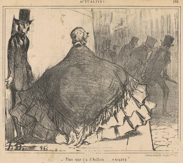 Editor: Here we have Honoré Daumier’s lithograph, “J’aimerais autant voir un ouragan...” from around the 19th century. It depicts a woman with a gigantic dress and a man looking none too pleased. I’m struck by the clear disdain in the man's posture, contrasted against the absurd scale of the woman's dress. What's your take on this? Curator: It’s crucial to understand Daumier's position as a social critic. He used lithography, a relatively inexpensive medium, to reach a wide audience. In this piece, think about what the crinoline represents. It wasn't just fashion; it was a status symbol, a display of wealth and leisure during a time of increasing social inequality. Editor: So the crinoline represents social excess? Curator: Precisely! And note the man's exasperated expression. Daumier is likely critiquing the old guard's resistance to the shifting social landscape of the 19th century, particularly regarding conspicuous consumption. Does the environment around them give you any further clues? Editor: It seems overgrown, almost chaotic. Is that a deliberate choice, perhaps suggesting a world overwhelmed by these extravagant displays? Curator: Yes! The uncontrolled nature reflects the man's own sense of being overwhelmed, perhaps even displaced by these changing social norms. How might viewers have reacted to this in its time? Editor: I imagine this cartoon might have triggered a knowing chuckle among those feeling similarly suffocated by social expectations and inequality. I hadn't really thought about fashion as such a strong political statement. Curator: Daumier excelled at turning everyday observations into potent critiques, revealing the social undercurrents of Parisian life. Hopefully you will have a good understanding of the complex meanings woven into this seemingly simple image.