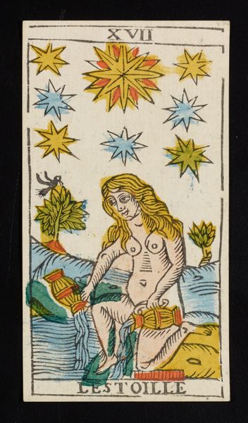 Claude Burdel created this woodblock print tarot card, titled "The World," sometime in the 1700s. It’s made with a relief printing process, where the design is carved into a block of wood, ink is applied to the remaining surface, and then pressed onto paper. The blocky lines and simplified forms are characteristic of this technique. The colors were added using stencils. Imagine the labor involved in carving the wood, mixing the inks, and carefully applying each color layer. The image itself is a fascinating mix of cultural symbols. The central figure, surrounded by a wreath, represents completion and integration. In the corners, we see the symbols of the four evangelists, drawn from Christian iconography. The card would have been relatively inexpensive to produce, circulating widely among different social classes, offering guidance, or perhaps just a bit of diversion, in a world undergoing rapid change. Looking closely at the materials and methods used to create this card reminds us that even seemingly simple images carry complex histories of making, labor, and belief. It blurs the boundaries between art, craft, and popular culture.
