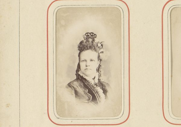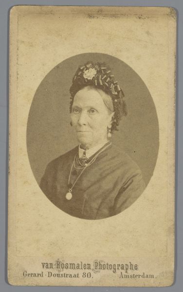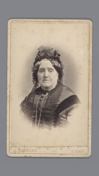 Curator: How striking. It feels… melancholic. Like a faded memory just barely clinging to existence. Editor: Exactly. This is a photograph, a gelatin-silver print to be exact, possibly from 1878. It's titled "Portret van een onbekende vrouw"—Portrait of an Unknown Woman—and was captured by Carl Wilhelm Bauer. We’re fortunate enough to have it here at the Rijksmuseum. Curator: "Unknown," you say? Makes me wonder what stories are locked away in those eyes. There's something incredibly dignified, even stoic, about her expression. Though, that severe bonnet probably didn't tickle! Editor: Bonnets in general tend to represent modesty and virtue. More broadly, women's headdresses speak to social position, marital status, and even religious affiliations, which might unlock part of our story here. It all gets communicated so deliberately, doesn't it? And the high, ruffled collar... constricting, almost! Curator: Precisely! I feel it too. And while there is definitely social and economic position on display, this woman possesses an air that seems to defy constraints. I almost see her laughing, wryly, beneath that buttoned-up dress. Or am I projecting? Editor: Projection isn't always a bad thing, artist! It signals our deep desire for connection. And isn't that what photography is all about—a desire to hold on, to connect with a moment that's already gone? This photograph feels like a memento mori, urging reflection on mortality and what's left behind. Curator: Absolutely! Although that makes me slightly uncomfortable and anxious. Her story may be hidden, lost in time. However, what isn't lost is her humanity. Looking at her reminds me to breathe, take up my space. In this portrait she feels eternal and temporary all at the same time, no small feat, I think! Editor: I like that—"eternal and temporary." She certainly embodies an archetype, a sense of endurance, preserved within this frame. Well, maybe now we've invited others to weave new stories for her. Curator: Exactly. New meanings, and therefore, new life, maybe! That's the magic.