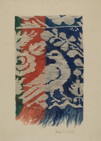 Curator: Looking at this, I’m suddenly craving a Turkish delight! It’s just so exuberantly ornate and delicious looking. Editor: Indeed! What you're seeing here is a piece entitled "Printed Cotton", designed by Alice Cosgrove sometime between 1935 and 1942. The material itself combines watercolor illustration and drawing techniques upon fabric to realize this vibrant sample. Curator: You know, the “incomplete-ness” of it—the way the design fades into ghostly outlines—is quite powerful. It feels like catching a dream on its way out the door. It’s there, then…not quite. Editor: That tension speaks volumes about textile design’s role. Cosgrove was part of a system—a manufacturer probably—responding to trends and demands. This wasn’t “art for art's sake” but something intended for circulation, for use in the everyday. That tentative feel may be suggestive of designs that remained unrealized due to wartime resource scarcity. Curator: It makes you wonder what rooms, what lives this cotton might have adorned! Were they grand sitting rooms, or simple bedrooms filled with laughter and children’s toys? It has a kind of naïve quality that speaks to hope, maybe, in uncertain times. Like a riot of summer blooms blooming against a winter sky. Editor: Precisely! And consider the history of pattern books, design samples, the dissemination of images—all part of an economy of vision. “Printed Cotton” existed to persuade, to promise the buyer a particular kind of aesthetic identity or even, aspiration. Curator: Mmh. It reminds me how profoundly intertwined design is with identity—both personal and cultural. I think that tension of "realized vs unrealized" makes me consider what could have been possible. The possibilities feel endless! Editor: So well put. This work isn't merely about its surface; it is suggestive of larger cultural infrastructures and aspirations—material witnesses to our persistent need to imprint ourselves and our desires on the world around us.