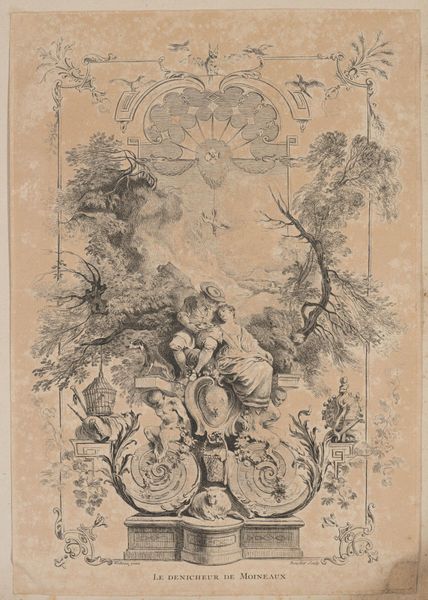 Curator: This is François Boucher's "The Sparrow's Nest Thief", an etching on plate. It's teeming with life, but there's also a tension, isn't there? A sense of taking something that doesn't belong to us. Editor: I see that! It's so ornate, but the title makes you think about exploitation, even of nature. What's your take on this piece? Curator: Boucher was a Rococo master, and his work often reflects the aristocracy's detachment from the realities of the working class. It's interesting how he uses this idyllic scene to maybe critique, even subtly, that power dynamic. What do you think? Editor: That's a great point. I hadn't considered it in terms of social commentary. Maybe the "theft" is symbolic of larger societal imbalances. Curator: Precisely! Seeing it through that lens makes the work even more relevant today, doesn't it? Editor: Absolutely, it’s made me rethink how art can reflect and challenge power structures.