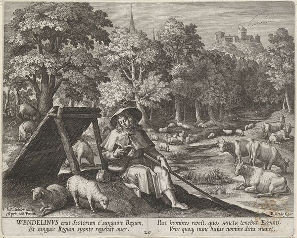 Editor: So, here we have "Ephaestius de kluizenaar," or "Ephaestius the Hermit," an engraving by Johann Sadeler I, dated to 1600. It’s held at the Rijksmuseum. I'm struck by how detailed and dense it is, like a whole world rendered in miniature, and yet quite gloomy! What’s your take on it? Curator: Gloomy, yes, but isn’t there something delicious about that darkness? The forest breathes a certain hushed secret. I get lost in the dance of light and shadow that Sadeler created with the engraving technique. It's like he's not just depicting a scene, but a feeling, a moment of contemplative solitude that has the aura of folklore. He’s pulling from a deep well of Northern Renaissance symbolism, isn’t he? Does it spark anything for you? Editor: Definitely! That hermit's gesture…he looks like he is warding off something, a past life perhaps, maybe society itself? Curator: Precisely! And then, that pair by the stream seems utterly separate, as if the Hermit has cast himself out. There is, as the text below confirms, an anecdote behind the image, a hidden message of morality that reveals more each time I read it. It almost transcends being an illustration; it feels like a whispered story. Editor: A whispered story…I like that. So, beyond the surface, it's more about the weight of choices and self-imposed exile? Curator: It's a world filled with melancholy but hints at finding truth outside of conventional existence. He shows it is a choice that we make, it exists, and if we listen to the whispering trees maybe we can choose rightly. Editor: I see it in a new light now. The gloom gives way to a kind of profound self-awareness, a solitude that allows the character to make such choices. Curator: And isn't it amazing how a simple engraving can achieve such complexity? Art becomes, again, a doorway to deeper introspection.