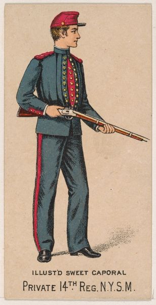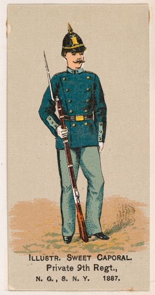 This image of a Saxon Sharpshooter from 1880 was made in Germany by the Kinney Tobacco Company. Produced using chromolithography, a color printing technique where multiple lithographic stones are used, each applying a different color ink, it was created to promote Sweet Caporal Cigarettes. The image is a flat, mass-produced object. This medium allows for detailed depictions of the soldier's uniform, weapon, and posture. The choice of chromolithography, rather than a unique art material, emphasizes the card’s status as a commercial product, intended for wide distribution. It shows how a company used advanced printing methods to promote their brand, tapping into the widespread interest in military prowess and national identity at the time. It's interesting how the image uses craft and artistry to serve the needs of industry and advertising, blurring the lines between art, commerce, and propaganda.