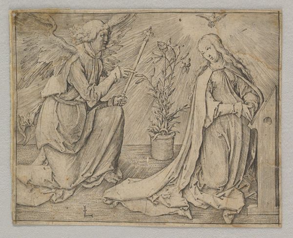 Mary kneels in an interior that, however distorted in terms of perspective, conveys an atmosphere of intimacy and comfort. She has been reading—the devout book is still in her hand—when the Archangel Gabriel surprises her with his appearance. He holds a scroll in reference to the message he brings: Mary has been chosen to give birth to the Son of God. Like a sign of the Immaculate Conception, the Master E.S. has incorporated the Holy Spirit entirely into Mary’s halo.