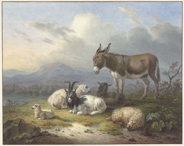Wybrand Hendriks created this drawing of goats and sheep in a hilly landscape using pen in brown and grey, brush in grey, and watercolour. Notice the subdued colour palette. The tranquil scene unfolds with soft gradations of grey, brown, and green, evoking a serene yet somewhat muted atmosphere. The sheep and goats are arranged across the gently sloping hills, their forms defined by delicate strokes that emphasize their woolly textures. The composition invites us to consider the relationship between nature and representation, where the pastoral scene serves as a canvas to explore formal elements like line, texture, and colour. In this idyllic rendering, Hendriks engages with the philosophical currents of his time, reflecting on nature and humankind's place within its framework. Ultimately, the artwork is a testament to the enduring power of art to invite contemplation and interpretation.